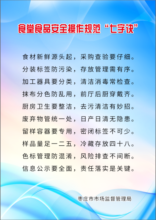 为引导集中用餐单位食堂规范操作加工过程,加强食堂食品安全管理,建立食品安全标准化、规范化管理体系,帮助食堂工作人员更好地理解和执行《餐饮服务食品安全操作规范》,市市场监管局制定食堂食品安全操作规范“七字诀”,保障就餐人员饮食安全。“七字诀”涵盖了食堂食品安全管理的关键环节,包括原料采购、储存管理、加工制作、卫生清洁等方面。为确保有效推广和应用,市局印制了2000份“七字诀”,将在全市集中用餐单位食堂关键部位张贴宣贯。