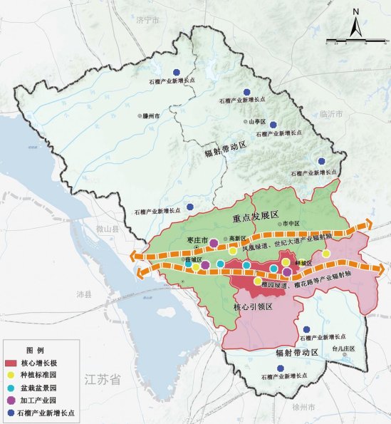 ——全国最大的石榴产品贸易物流中心。完善冷链保鲜、仓储物流、电子商务和质量检测等配套服务功能,扩大石榴鲜果、苗木、盆景盆栽、文创产品和石榴制品交易规模,打造辐射全国的石榴产品贸易物流中心。大力实施“互联网+石榴”计划,推进枣庄石榴云大数据平台建设,完善石榴线上线下交易功能,加快形成“买全国、卖全国”发展格局。